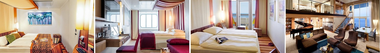 - Suity – najväčšie a vybavením najpohodlnejšie apartmány, často s oddelenou obývacou a spálňovou časťou; a s extra službami a zariadením ako napríklad súkromný komorník, vírivá vaňa v kúpeľni a / alebo/ aj na balkóne, veľká zariadená terasa s ležadlami iba pre vás, vstup do lodného spa, stravovanie v exkluzívnej reštaurácii, prioritné nalodenie a vylodenie ...