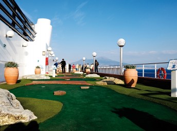 Šport: fitness centerum, minigolf, 2 bazény, detský bazén, bežecká dráha, stolová hra shuffleboard