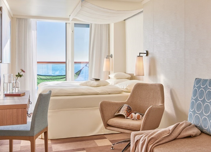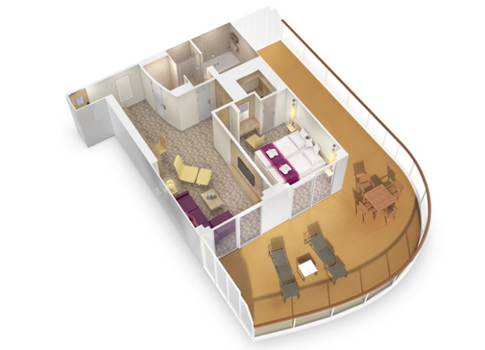 SC - Suite PREMIUM40 m²+ terasa 33 m². 8. až 15. paluba. Max 5 osôb. Cenový model Premium + výhody Suite.
