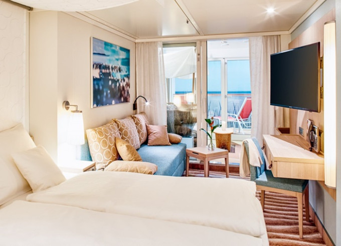 JA - Junior Suite s balkónom PREMIUM34 m² + terasa 27,5 m². 8. až 15. paluba. Max 4 osoby. Cenový model Premium + výhody Junior Suite.