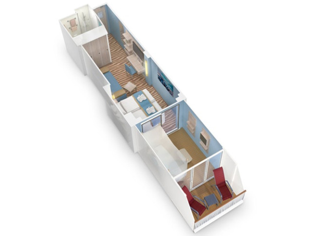 | VA - Kajuta s verandou Komfort PREMIUM 17,5 m² + balkón 5,5 m². 8. až 17. paluba. Max 4 osoby. Cenový model Premium. | 3 690 € 1 845 € za osobu | ||
