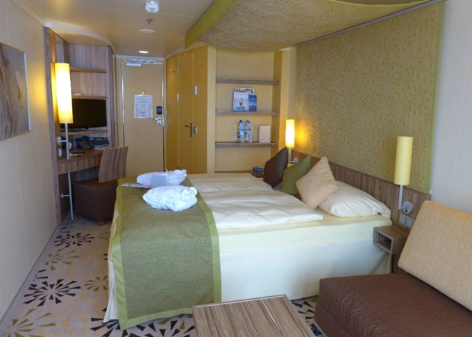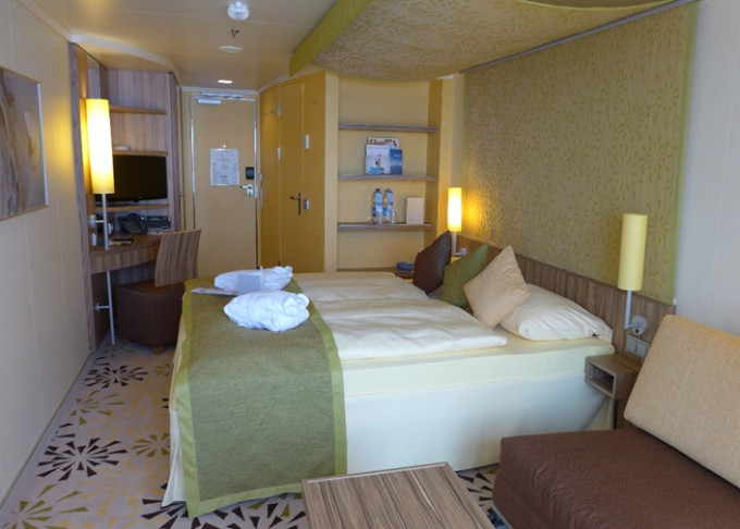 CA - Vonkajšia kajuta PREMIUM / obmedzený výhľad od 14 m². Neotvárateľné okno / obmedzený výhľad. 6. paluba. Max 4 osoby. Cenový model Premium. 3 830 € 1 915 € za osobu