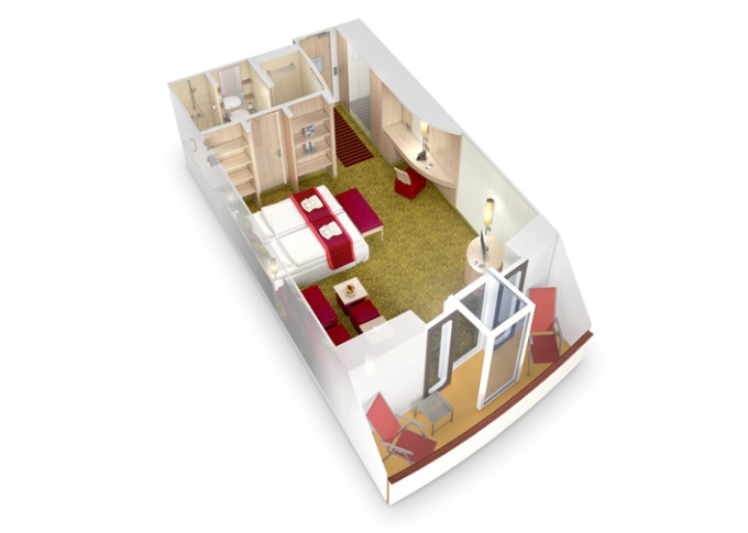 BP - Kajuta s balkónom Panorama PREMIUM 21,5 m² / balkón 4,5 m². 12. paluba. Max 3 osoby. Cenový model Premium. 6 520 € 3 260 € za osobu