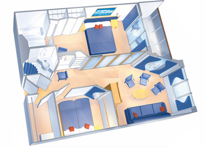 | RS - Royal Suite s balkónom 106 m² + balkón 10 m². Kúpeľňa s vírivkou. 8. paluba. Max 4 osoby. Výhody Suite. | 11 442 € 3 814 € za osobu |