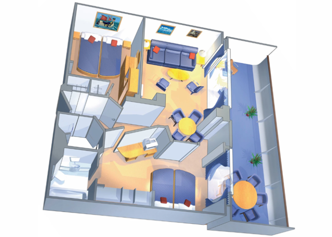 | VP - Ocean View Panoramic Suite (bez balkónu) 37 m². Panoramatické neotvárateľné okná. Oddelená časť s poschodovou posteľou. Max 6 osôb. Výhody Suite. | 6 006 € 2 002 € za osobu |
