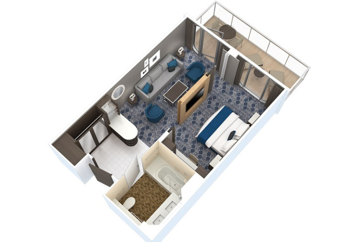 1A - Veľká kajuta s veľkým balkónom Ultra Spacious 34 m² + balkón 7 m². 11. paluba. Oddelená časť s poschodovou posteľou. Max 6 osôb. 2 277 € 2 277 € za osobu