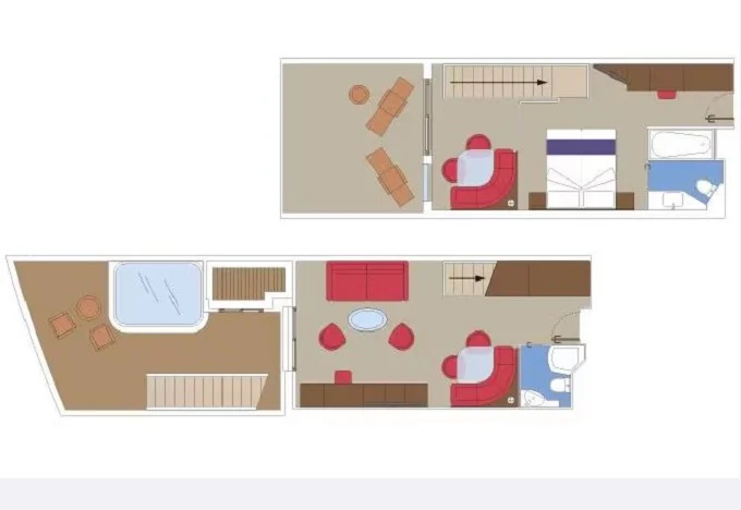 | YJD - Yacht Club Duplex Suite s vírivkou 46 m² + balkón 28-31 m². Vírivka. 2 podlažia, šatník, 2 kúpeľne (1 s vaňou). Max 4 osoby. 16. paluba. Cenový model MSC Yacht Club. Basic fare | 8 482 € 4 241 € za osobu |