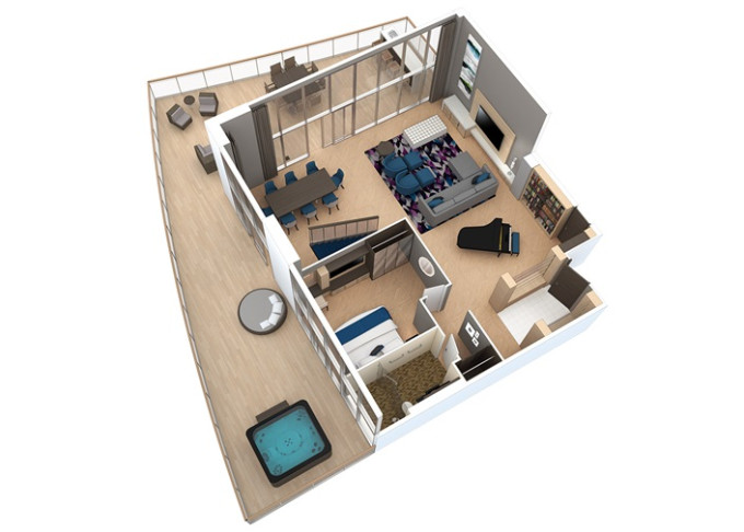 | L1 - Crown Loft Suite s balkónom 50 m² + balkón 10 m². 2-podlažný apartmán. 17. paluba. Max 4 osoby. Výhody Royal Suite Sky Class. | 7 808 € 3 904 € za osobu | ||